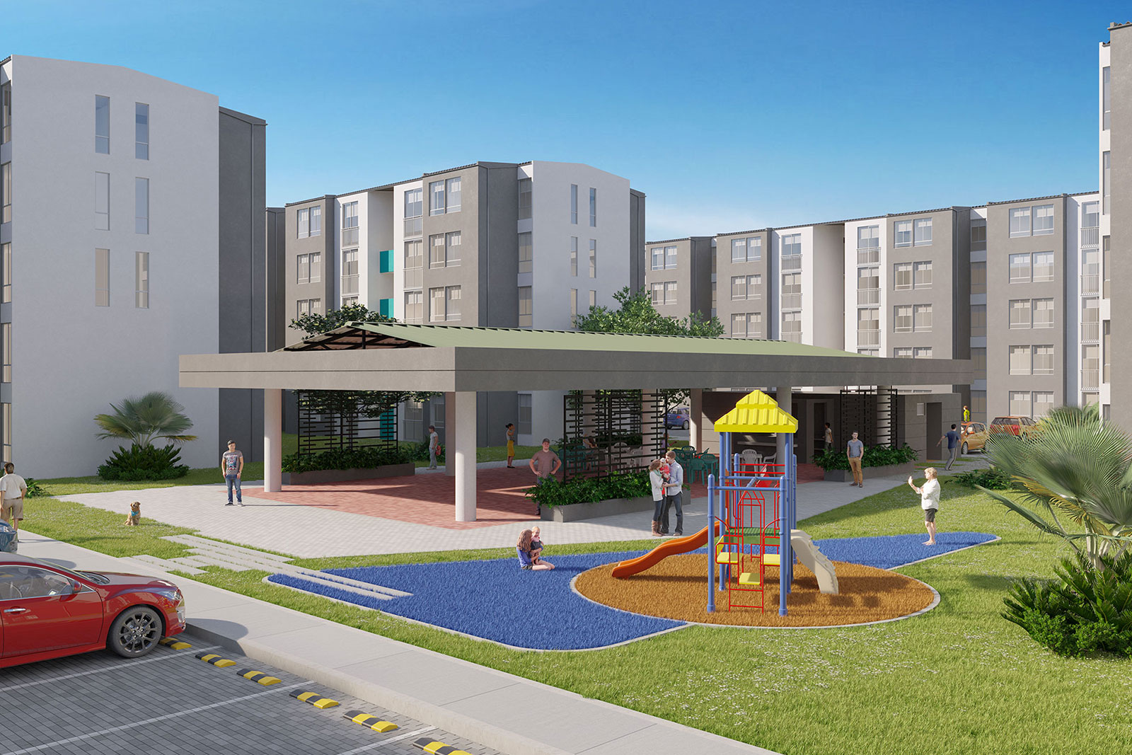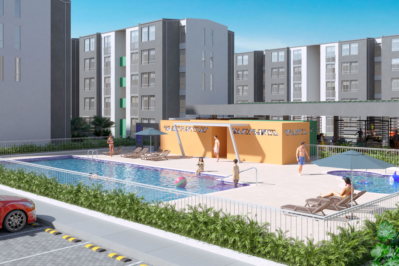 Cuenta con zonas comunales para el uso de sus habitantes como, cuarto de basuras, portería y recepción, salón comunal, piscina y juegos infantiles.
